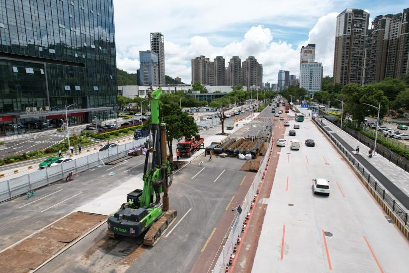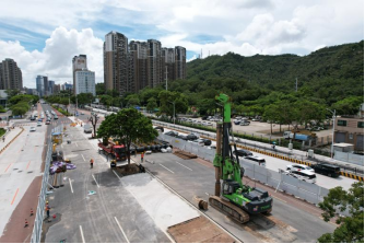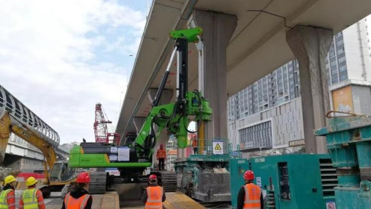 ES低凈空系列旋挖鉆機(jī)是泰信機(jī)械應(yīng)客戶的不同需求,針對在建筑物與大型隧道內(nèi)、橋梁與高壓線下等限高及狹小空間環(huán)境中施工的工況而定制的技術(shù)方案與機(jī)型,而城市快速路改造往往面臨嚴(yán)苛的施工空間限制及極高的安全施工要求。九洲大道項目施工安全要求極高的同時空間有限,對設(shè)備高度提出嚴(yán)苛要求。泰信機(jī)械KR300ES低凈空旋挖鉆機(jī)憑借其定制化9米低施工高度設(shè)計,在此類城市狹小空間作業(yè)中展現(xiàn)出不可替代的優(yōu)勢,成功解決了傳統(tǒng)大型設(shè)備施工傾倒的潛在危險性及需要較大施工工作面的痛點(diǎn)。